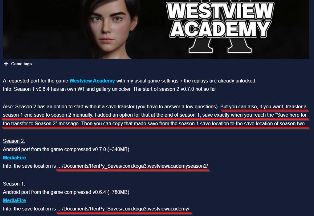Game tags (from F95zone “Genre”): 3DCG, Animated, Ahegao, Creampie, Female Protagonist, Footjob, Big Ass, Big Tits, Blackmail, Cheating, Corruption, Groping, Handjob, lesbian, Masturbation, Oral Sex, Stripping, Teasing, Voyeurism, Adventure, Cosplay, Vaginal sex, Management, Point & Click, Sandbox, School Setting, Sex Toys Planned Tags: Anal Sex, Bdsm, Dilf, Exhibitionism, Group sex, Humiliation, Interracial, Milf, Multiple Penetration, Netorare, Prostitution, Spanking, Swinging, Titfuck, Fantasy, Mind control, Monster